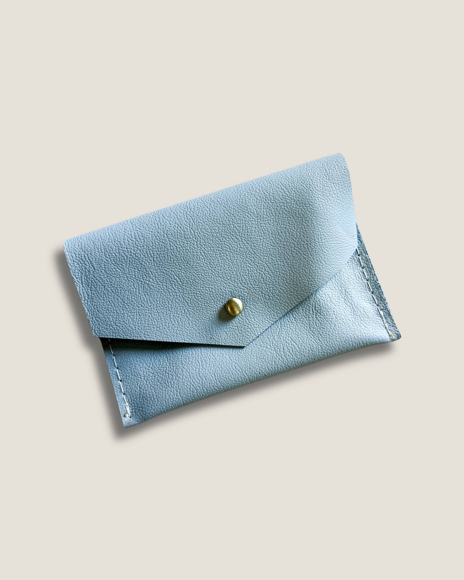 Leather card wallet with an antique brass button clasp. Natural suede interior, holds multiple cards and folded cash.