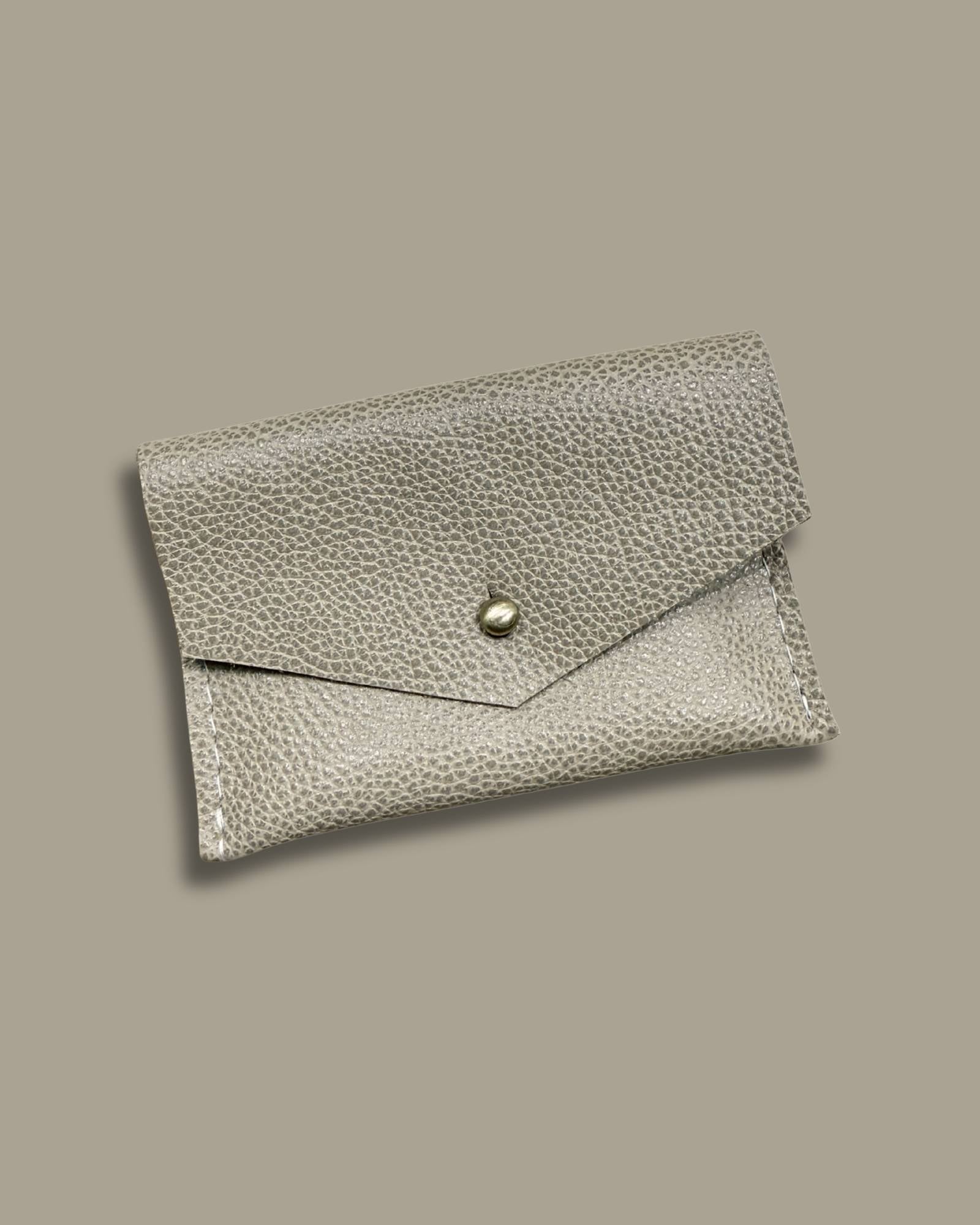 Leather card wallet with an antique brass button clasp. Natural suede interior, holds multiple cards and folded cash.