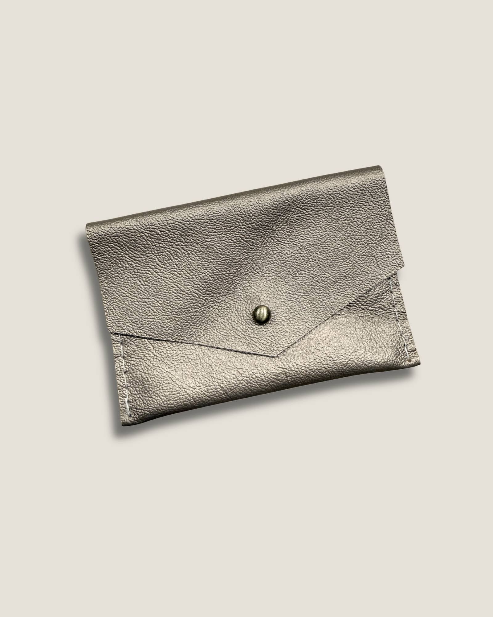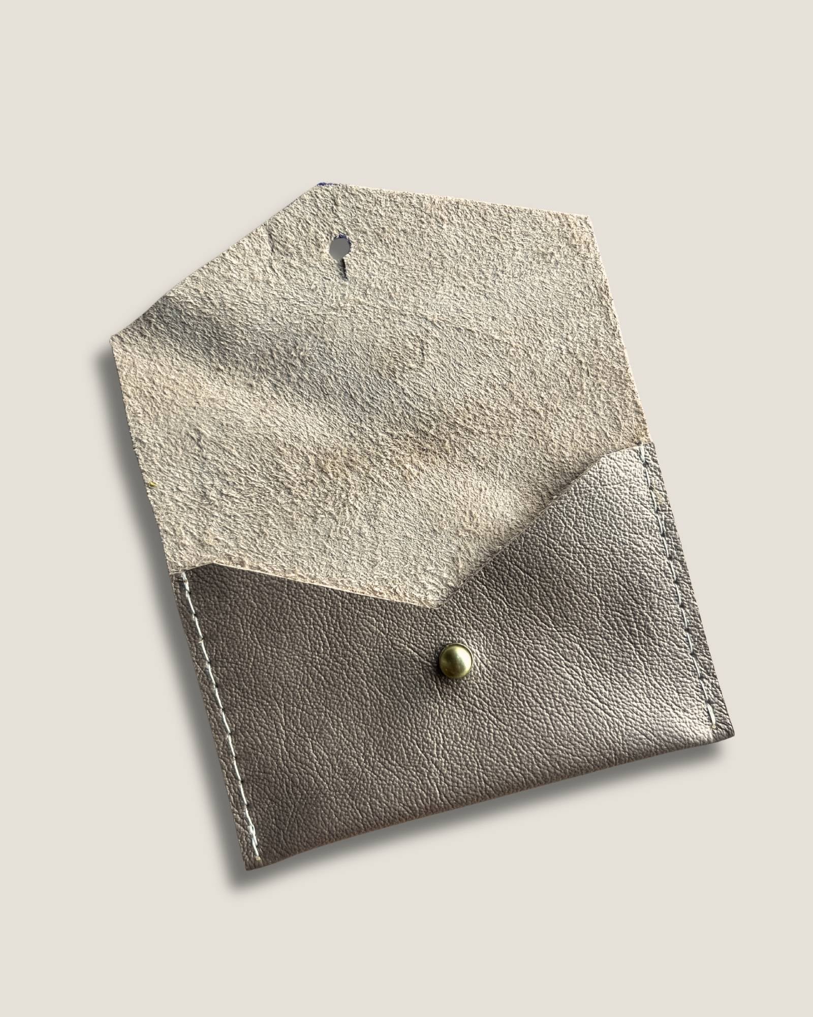 Leather card wallet with an antique brass button clasp. Natural suede interior, holds multiple cards and folded cash.