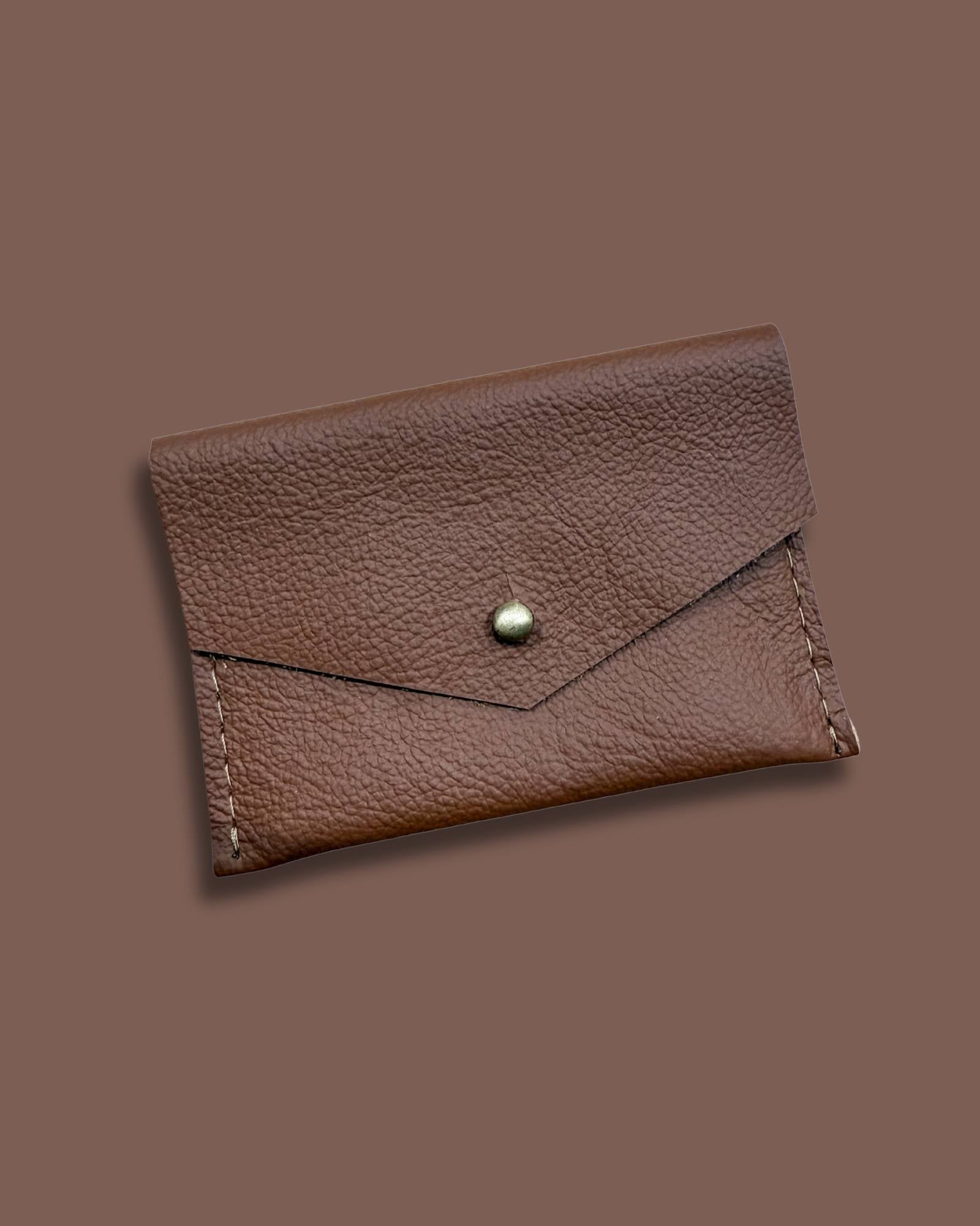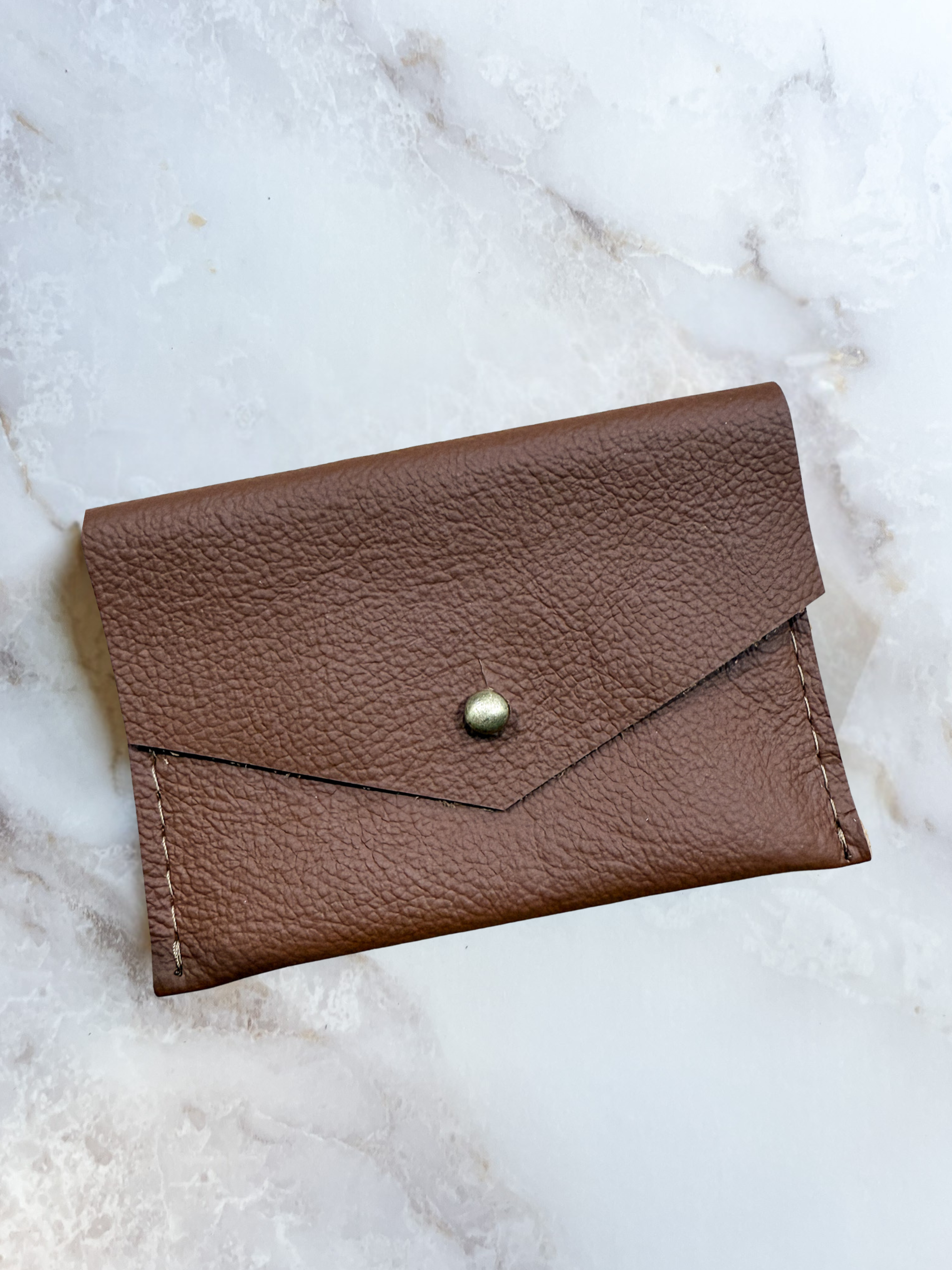 Leather card wallet with an antique brass button clasp. Natural suede interior, holds multiple cards and folded cash.