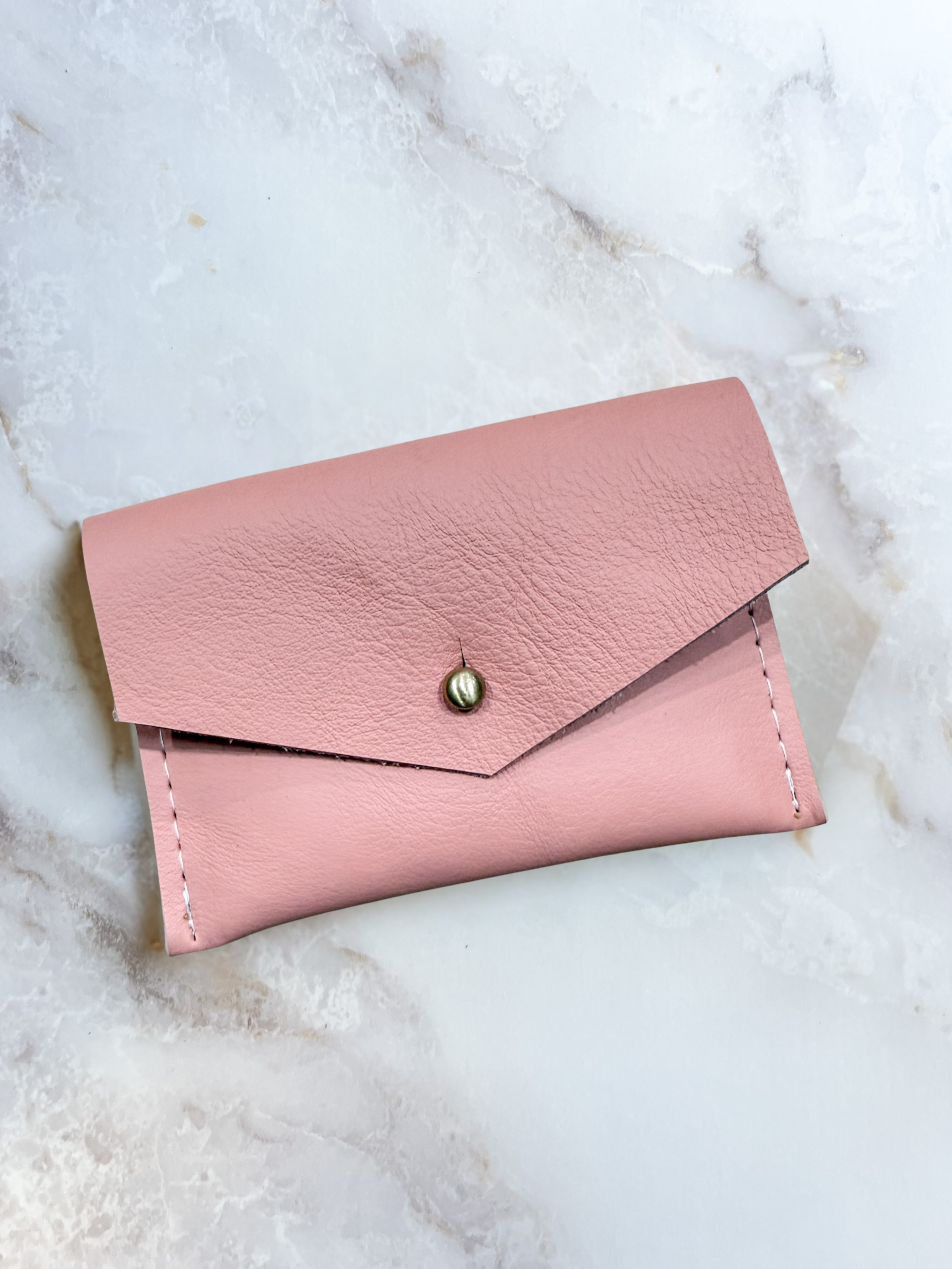 Leather card wallet with an antique brass button clasp. Natural suede interior, holds multiple cards and folded cash.